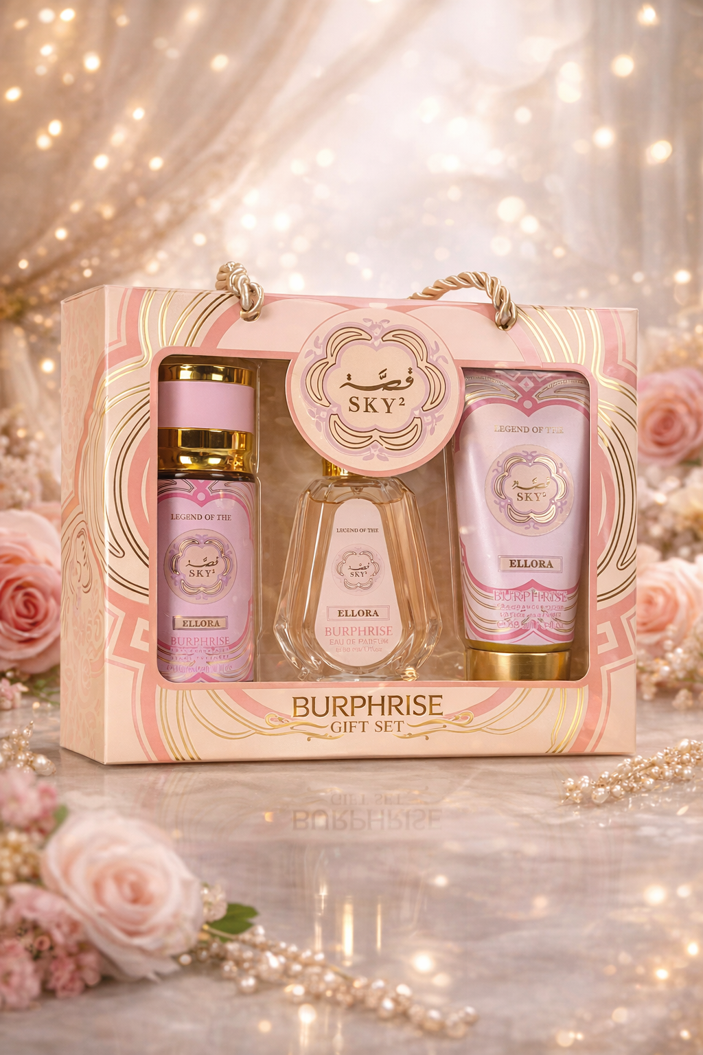 Experience timeless elegance with the SKY² – Ellora Burphrase Gift Set, a luxurious fragrance collection designed for women who love sophistication, softness, and romantic charm. With its delicate blush tones and gold accents, this set reflects pure femininity and graceful beauty.
